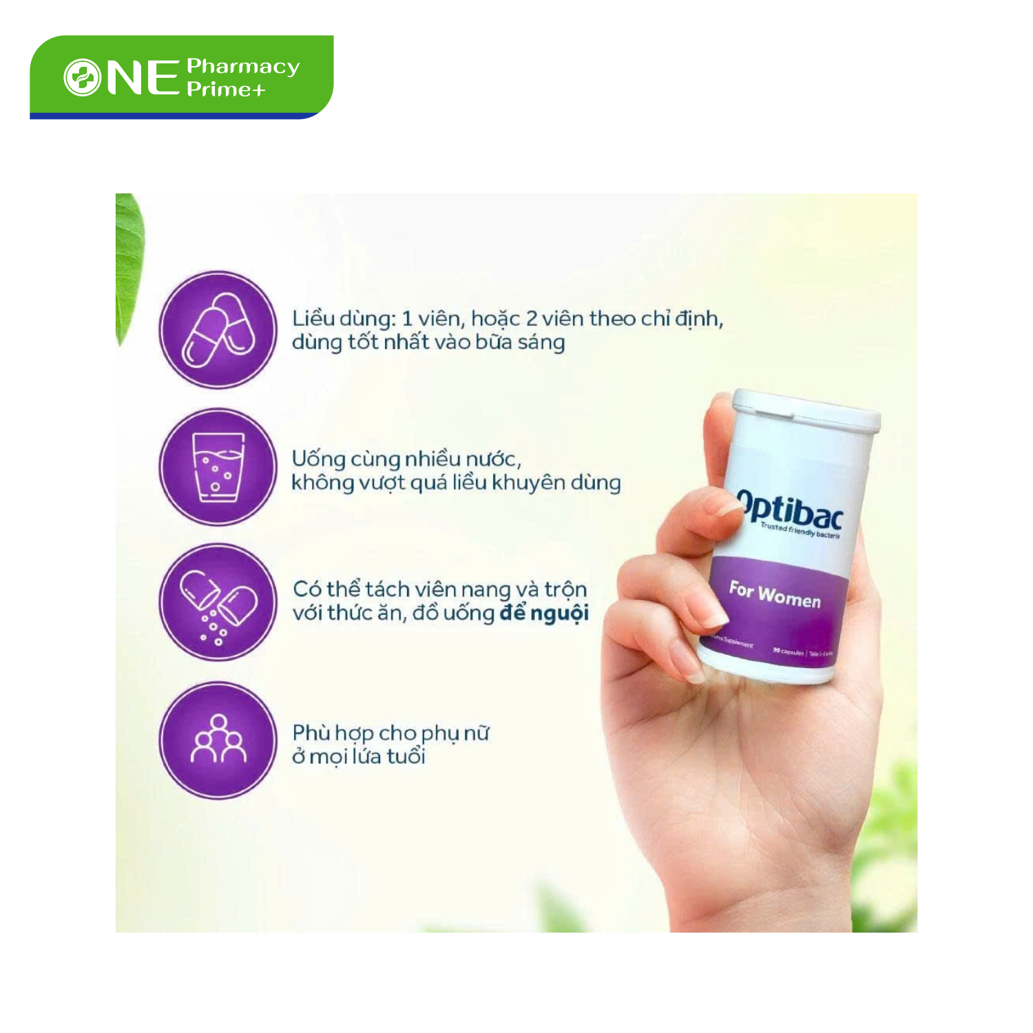 - Người dùng nên uống 1 viên mỗi ngày, tốt nhất là trong hoặc ngay sau bữa ăn. Với hộp 90 viên, sản phẩm thích hợp cho những người muốn duy trì sức khỏe phụ khoa và tiêu hóa trong thời gian dài. Optibac For Women có thể sử dụng an toàn cho phụ nữ trưởng thành khi dùng đúng liều lượng khuyến nghị.